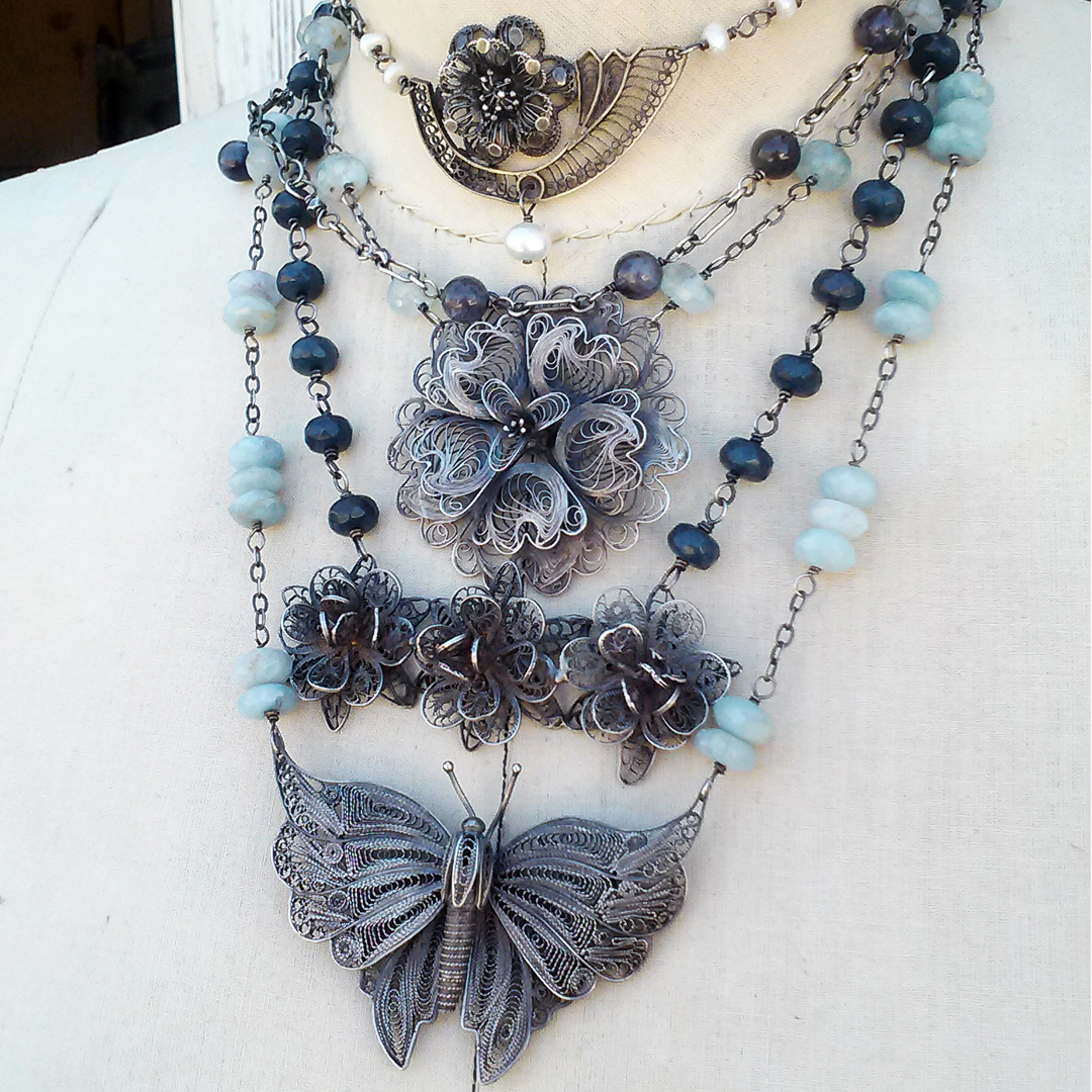 My favorite work is taking apart vintage jewelry, and then mixing it with dark earthy stones, and bringing the past and nature together into the present.